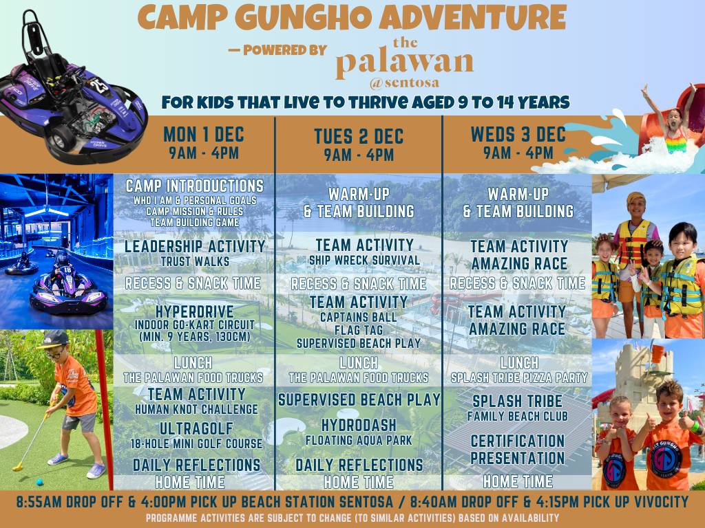 By entering this programme and activity, you are consenting to have photos or videos containing you to be recorded for publicity or promotional purposes by both Get GungHo Pte Ltd and The Palawan @ Sentosa. PERSONAL DATA: I acknowledge and agree that by registering my child/children, I hereby consent to the collection of my personal data and the personal data of my child/children for the purpose of registration but also for the commercial purposes of both Get GungHo Pte Ltd and The Palawan @ Sentosa and that any request to remove personal data shall be acknowledged to us by email to team@getgungho.com and CC: enquiry@thepalawansentosa.com